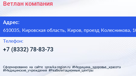 Ветлан, компания по адресу 610035, Кировская область, Киров, проезд Колесникова, 10 в дальнейшем Организация, размещена в следующих категориях: