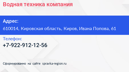 Водная техника, компания по адресу 610014, Кировская область, Киров, Ивана Попова, 61 в дальнейшем Организация, размещена в следующих категориях: