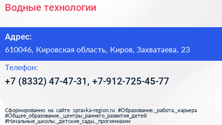 Водные технологии по адресу 610046, Кировская область, Киров, Захватаева, 23 в дальнейшем Организация, размещена в следующих категориях: