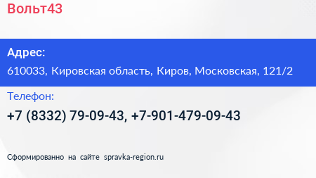 Вольт43 по адресу 610033, Кировская область, Киров, Московская, 121/2 в дальнейшем Организация, размещена в следующих категориях: