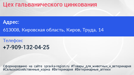 Цех гальванического цинкования по адресу 613008, Кировская область, Киров, Труда, 14 в дальнейшем Организация, размещена в следующих категориях:
