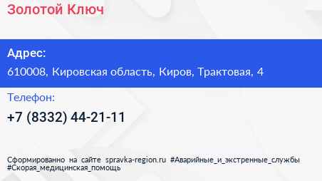 Золотой Ключ по адресу 610008, Кировская область, Киров, Трактовая, 4 в дальнейшем Организация, размещена в следующих категориях: