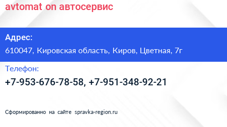 avtomat-on, автосервис по адресу 610047, Кировская область, Киров, Цветная, 7г в дальнейшем Организация, размещена в следующих категориях: