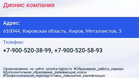 Дионис, компания по адресу 610044, Кировская область, Киров, Металлистов, 3 в дальнейшем Организация, размещена в следующих категориях: