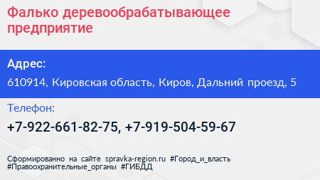 Фалько, деревообрабатывающее предприятие по адресу 610914, Кировская область, Киров, Дальний проезд, 5 в дальнейшем Организация, размещена в следующих категориях: