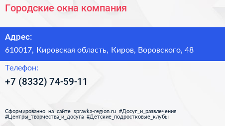 Городские окна, компания по адресу 610017, Кировская область, Киров, Воровского, 48 в дальнейшем Организация, размещена в следующих категориях: