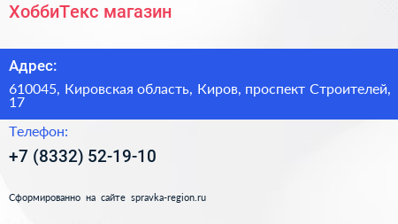 ХоббиТекс, магазин по адресу 610045, Кировская область, Киров, проспект Строителей, 17 в дальнейшем Организация, размещена в следующих категориях: