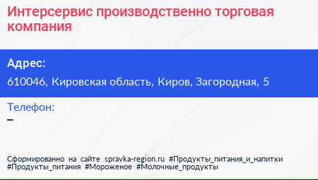 Интерсервис, производственно-торговая компания по адресу 610046, Кировская область, Киров, Загородная, 5 в дальнейшем Организация, размещена в следующих категориях: