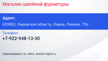 Магазин швейной фурнитуры по адресу 610002, Кировская область, Киров, Ленина, 79а в дальнейшем Организация, размещена в следующих категориях: