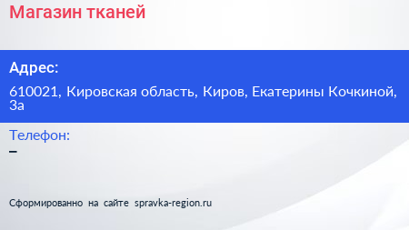 Магазин тканей по адресу 610021, Кировская область, Киров, Екатерины Кочкиной, 3а в дальнейшем Организация, размещена в следующих категориях: