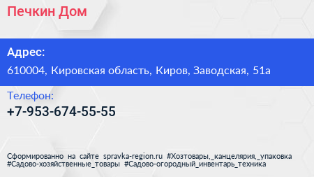 Печкин Дом по адресу 610004, Кировская область, Киров, Заводская, 51а в дальнейшем Организация, размещена в следующих категориях: