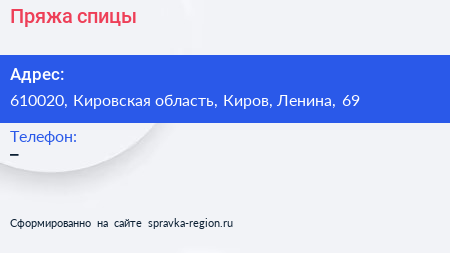 Пряжа & спицы по адресу 610020, Кировская область, Киров, Ленина, 69 в дальнейшем Организация, размещена в следующих категориях: