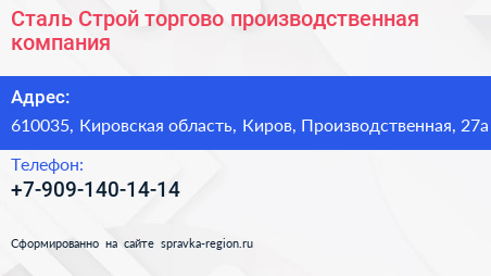 Сталь Строй, торгово-производственная компания по адресу 610035, Кировская область, Киров, Производственная, 27а в дальнейшем Организация, размещена в следующих категориях: