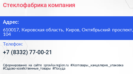 Стеклофабрика, компания по адресу 610017, Кировская область, Киров, Октябрьский проспект, 104 в дальнейшем Организация, размещена в следующих категориях: