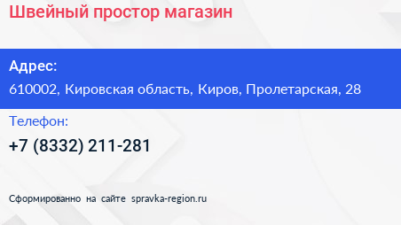 Швейный простор, магазин по адресу 610002, Кировская область, Киров, Пролетарская, 28 в дальнейшем Организация, размещена в следующих категориях: