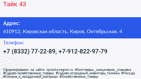 Тайк 43 по адресу 610912, Кировская область, Киров, Октябрьская, 4 в дальнейшем Организация, размещена в следующих категориях: