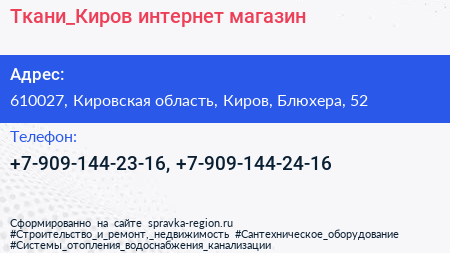 Ткани_Киров, интернет-магазин по адресу 610027, Кировская область, Киров, Блюхера, 52 в дальнейшем Организация, размещена в следующих категориях:
