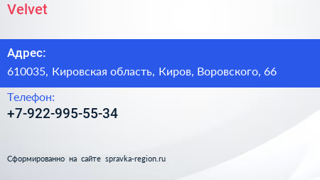 Velvet по адресу 610035, Кировская область, Киров, Воровского, 66 в дальнейшем Организация, размещена в следующих категориях: