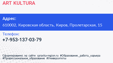 ART KULTURA по адресу 610002, Кировская область, Киров, Пролетарская, 15 в дальнейшем Организация, размещена в следующих категориях: