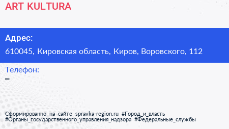 ART KULTURA по адресу 610045, Кировская область, Киров, Воровского, 112 в дальнейшем Организация, размещена в следующих категориях: