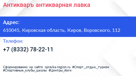 Антикваръ, антикварная лавка по адресу 610045, Кировская область, Киров, Воровского, 112 в дальнейшем Организация, размещена в следующих категориях: