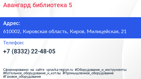 Авангард, библиотека №5 по адресу 610002, Кировская область, Киров, Милицейская, 21 в дальнейшем Организация, размещена в следующих категориях: