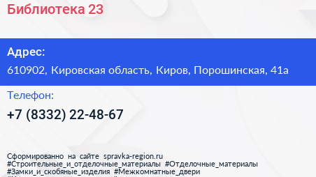 Библиотека №23 по адресу 610902, Кировская область, Киров, Порошинская, 41а в дальнейшем Организация, размещена в следующих категориях: