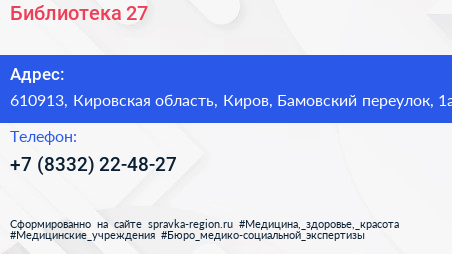 Библиотека №27 по адресу 610913, Кировская область, Киров, Бамовский переулок, 1а в дальнейшем Организация, размещена в следующих категориях: