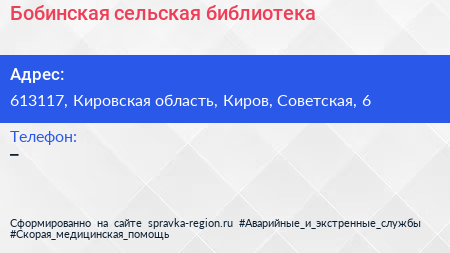 Бобинская сельская библиотека по адресу 613117, Кировская область, Киров, Советская, 6 в дальнейшем Организация, размещена в следующих категориях: