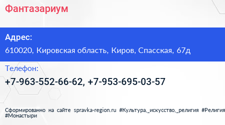 Фантазариум по адресу 610020, Кировская область, Киров, Спасская, 67д в дальнейшем Организация, размещена в следующих категориях: