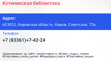 Кстининская библиотека по адресу 613012, Кировская область, Киров, Советская, 73а в дальнейшем Организация, размещена в следующих категориях: