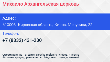 Михаило-Архангельская церковь по адресу 610008, Кировская область, Киров, Мичурина, 22 в дальнейшем Организация, размещена в следующих категориях: