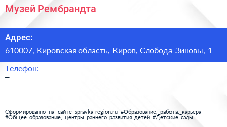 Музей Рембрандта по адресу 610007, Кировская область, Киров, Слобода Зиновы, 1 в дальнейшем Организация, размещена в следующих категориях: