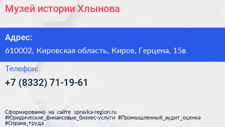 Музей истории Хлынова по адресу 610002, Кировская область, Киров, Герцена, 15в в дальнейшем Организация, размещена в следующих категориях: