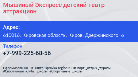 Мышиный Экспресс, детский театр-аттракцион по адресу 610016, Кировская область, Киров, Дзержинского, 6 в дальнейшем Организация, размещена в следующих категориях: