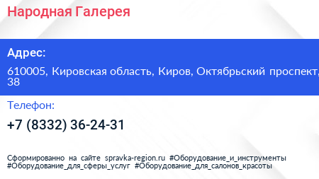 Народная Галерея по адресу 610005, Кировская область, Киров, Октябрьский проспект, 38 в дальнейшем Организация, размещена в следующих категориях: