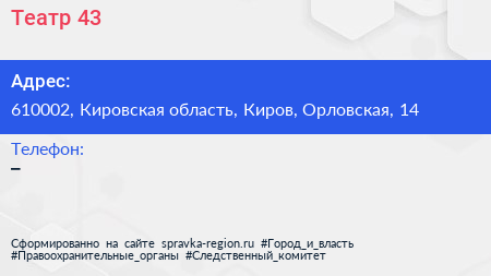 Театр 43 по адресу 610002, Кировская область, Киров, Орловская, 14 в дальнейшем Организация, размещена в следующих категориях: