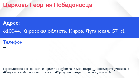 Церковь Георгия Победоносца по адресу 610044, Кировская область, Киров, Луганская, 57 к1 в дальнейшем Организация, размещена в следующих категориях: