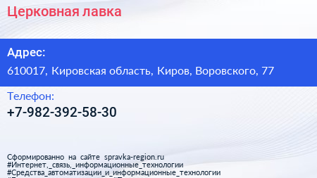 Церковная лавка по адресу 610017, Кировская область, Киров, Воровского, 77 в дальнейшем Организация, размещена в следующих категориях: