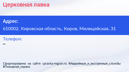 Церковная лавка по адресу 610002, Кировская область, Киров, Милицейская, 31 в дальнейшем Организация, размещена в следующих категориях: