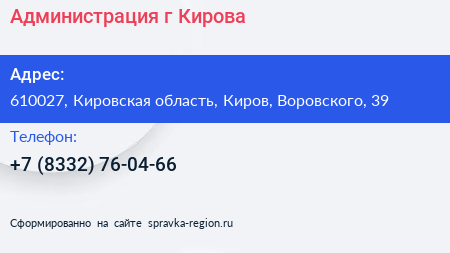 Администрация г. Кирова по адресу 610027, Кировская область, Киров, Воровского, 39 в дальнейшем Организация, размещена в следующих категориях: