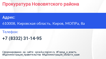 Прокуратура Нововятского района по адресу 610008, Кировская область, Киров, МОПРа, 8а в дальнейшем Организация, размещена в следующих категориях: