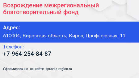 Возрождение, межрегиональный благотворительный фонд по адресу 610004, Кировская область, Киров, Профсоюзная, 11 в дальнейшем Организация, размещена в следующих категориях: