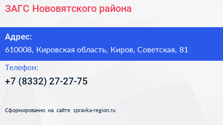 ЗАГС Нововятского района по адресу 610008, Кировская область, Киров, Советская, 81 в дальнейшем Организация, размещена в следующих категориях: