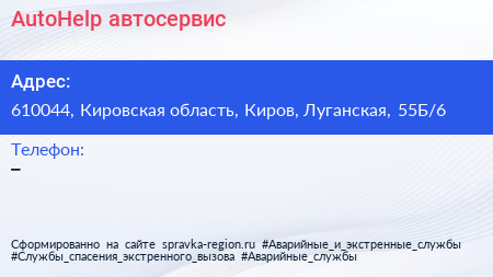 AutoHelp, автосервис по адресу 610044, Кировская область, Киров, Луганская, 55Б/6 в дальнейшем Организация, размещена в следующих категориях: