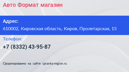 Авто-Формат, магазин по адресу 610002, Кировская область, Киров, Пролетарская, 15 в дальнейшем Организация, размещена в следующих категориях: