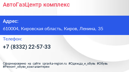 АвтоГазЦентр, комплекс по адресу 610004, Кировская область, Киров, Ленина, 35 в дальнейшем Организация, размещена в следующих категориях: