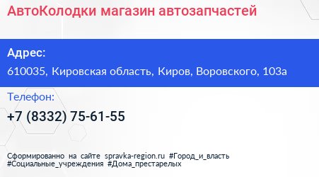 АвтоКолодки, магазин автозапчастей по адресу 610035, Кировская область, Киров, Воровского, 103а в дальнейшем Организация, размещена в следующих категориях:
