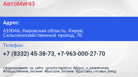 АвтоМиг43 по адресу 610046, Кировская область, Киров, Сельскохозяйственный проезд, 7Б в дальнейшем Организация, размещена в следующих категориях: