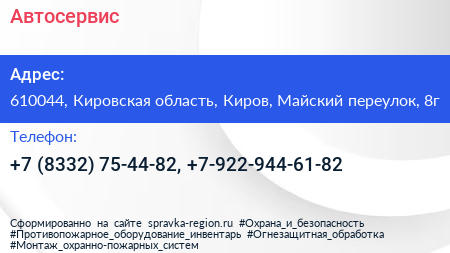 Автосервис по адресу 610044, Кировская область, Киров, Майский переулок, 8г в дальнейшем Организация, размещена в следующих категориях: